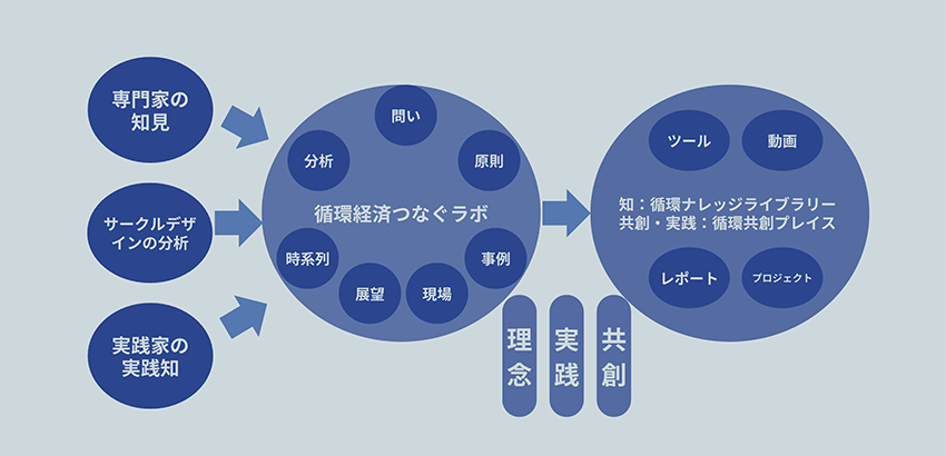 循環経済つなぐラボは、理念・実践知を生み出す拠点である「循環ナレッジライブラリー」と、共創により知やアクションを生み出す「循環共創プレイス」で構成されています。