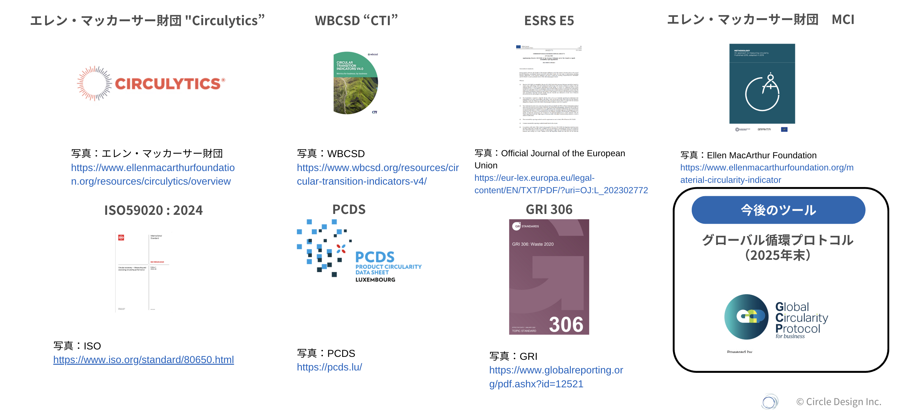 CATでは、下図のような、Circular Transition Indicators、ISO59020、Circulytics、Material Circularity Indicatorsといった国際的に利用されている既存評価測定ツールをもとに、各組織内の状況に応じて選択的または網羅的に活用します。